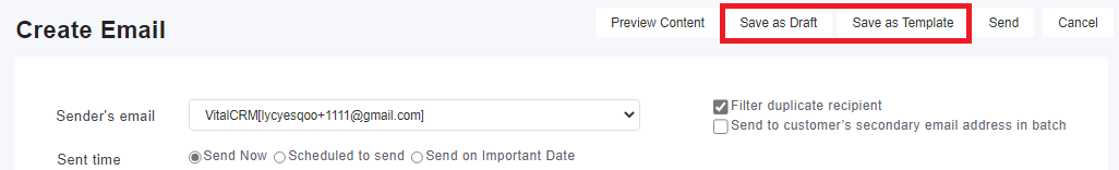 When creating a marketing email, in addition to sending the email directly, you can also save the email as a template or as a draft. The difference between these two functions is whether the content and settings of the email are complete.