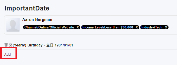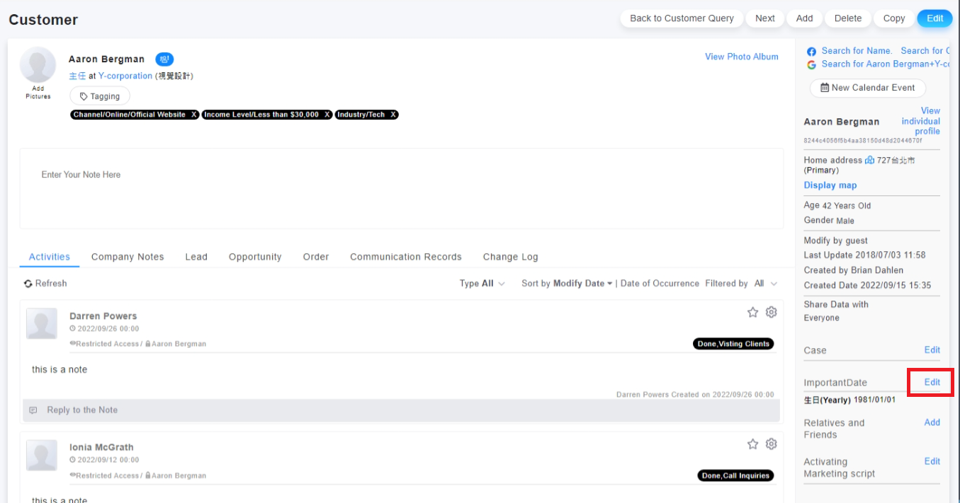 2. On the customer's profile tab, click on [edit] beside the "Important Date"