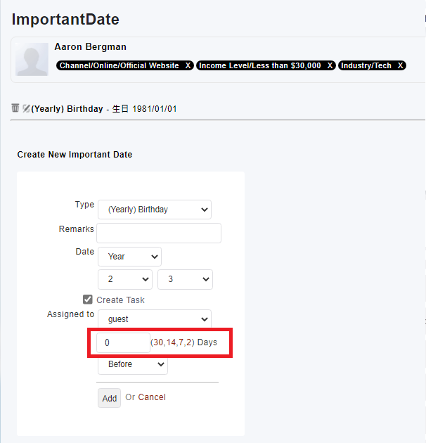 Note: If you want to notice day the same as the important date, please input "0" on "days" field when you setup the important date.