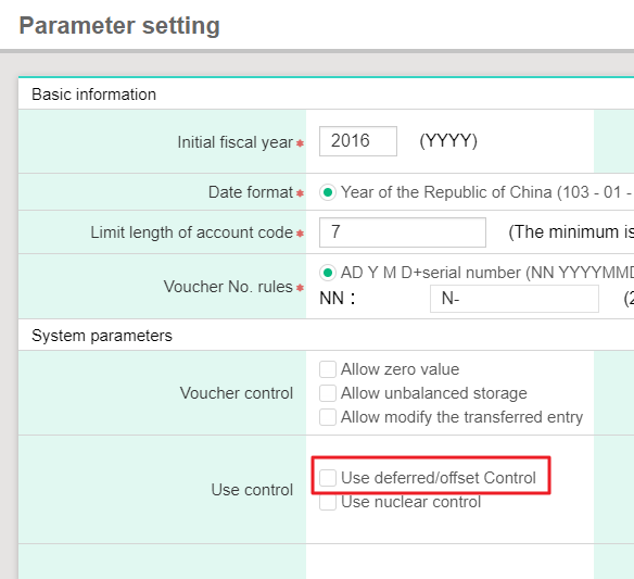 If you would like to use offset eport, please check [Use deferred/offset Control] first in [Parameter setting], and click [Maintenance>Account information>Account]. While choosing or adding accounts, if the account has to be offset, please check [Offset account].
