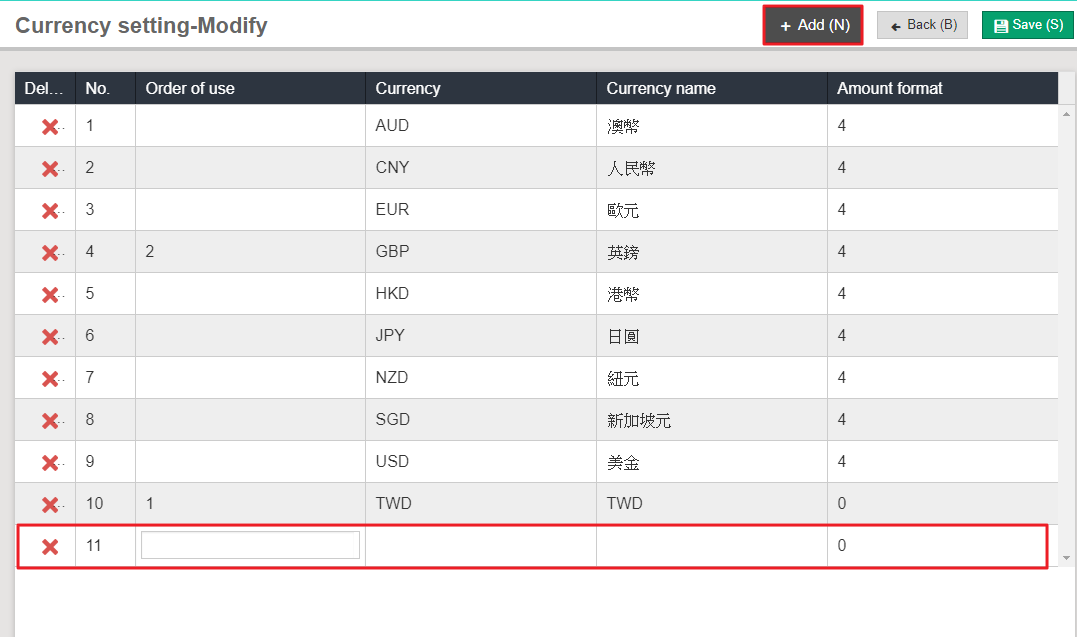 Please click [Maintenance> Currency setting], and click [Edit] in the right corner. After entering currency list, please click [Add] in the right corner to add data.