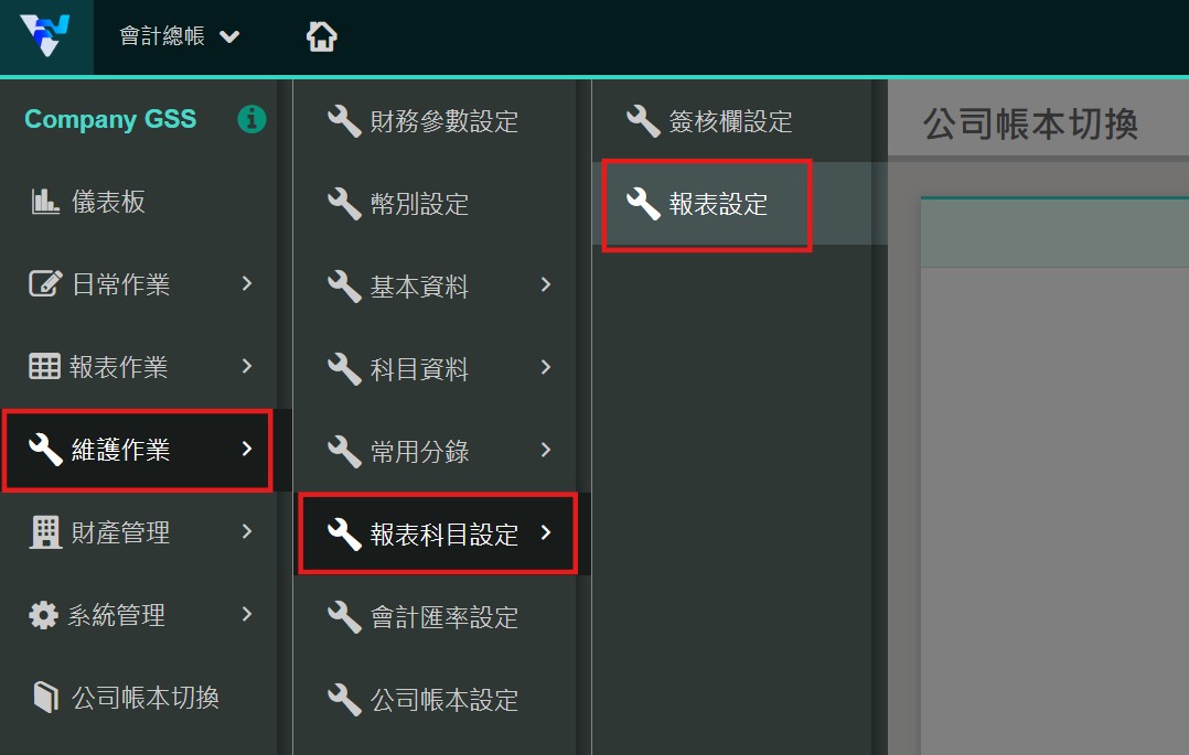 1. 請點選【維護作業>報表科目設定>報表設定】。