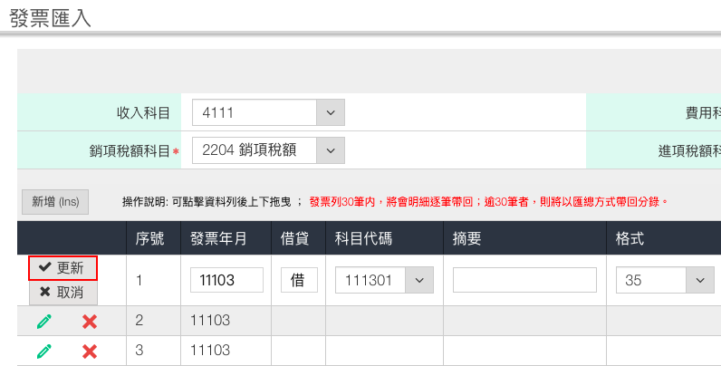 在修改模式下,請點擊發票明細左方的綠色鉛筆(修改)圖示開始修改,修改完成後請先點選「更新」後才存檔。