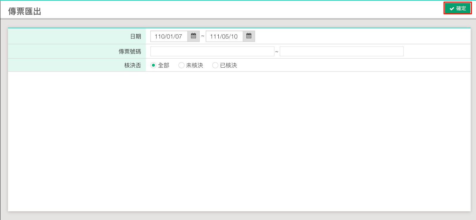 2. 可以依日期、傳票號碼、核決否查詢傳票,條件設好後請點擊右上角【確定】,即會匯出傳票的 excel 檔。