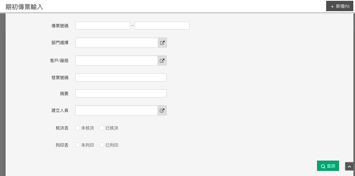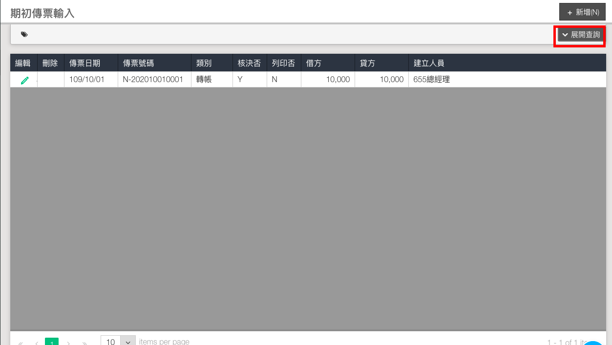 接著,您會看見期初傳票的列表,也可以點選右上方的「展開查詢」,輸入條件查詢傳票。