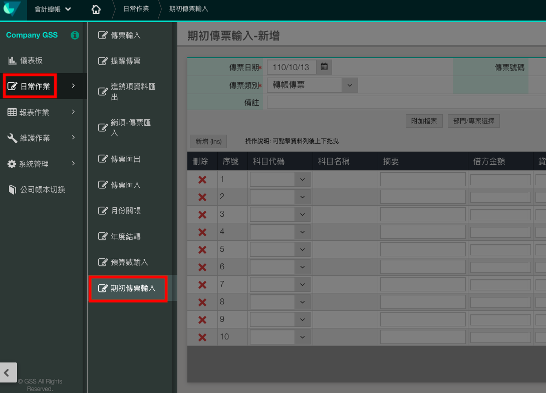 在首頁左方點選【日常作業>期初傳票輸入】。