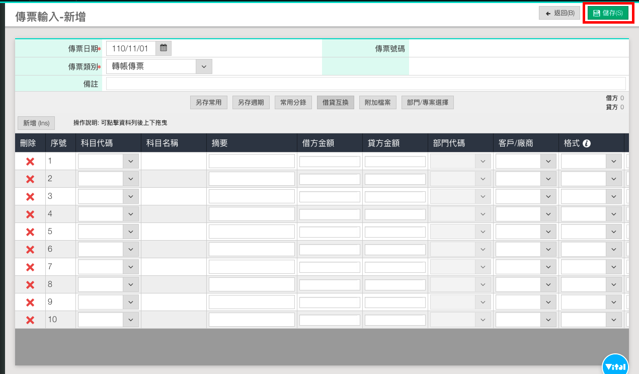 傳票輸入完成後,請點選右上角「儲存」,即完成傳票的新增。