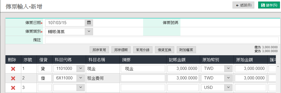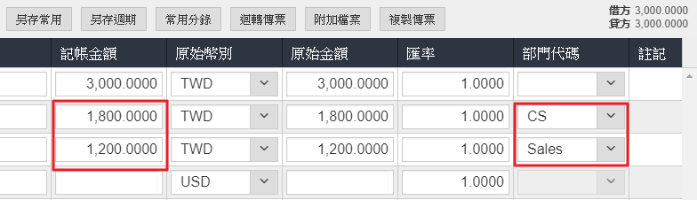 1. 請至【日常作業>傳票輸入】中點擊右方【新增】按鈕,進入頁面後開始新增欲做部門分攤的費用傳票。