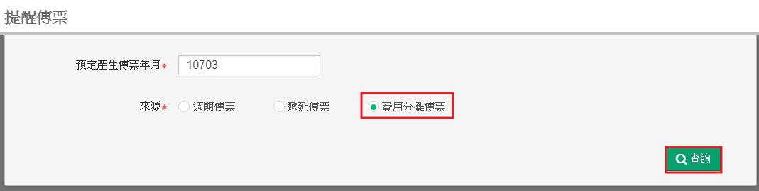 3. 在左方選單中點選【日常作業>提醒傳票】,於查詢頁面的來源欄位選擇「費用分攤傳票」,進行查詢。