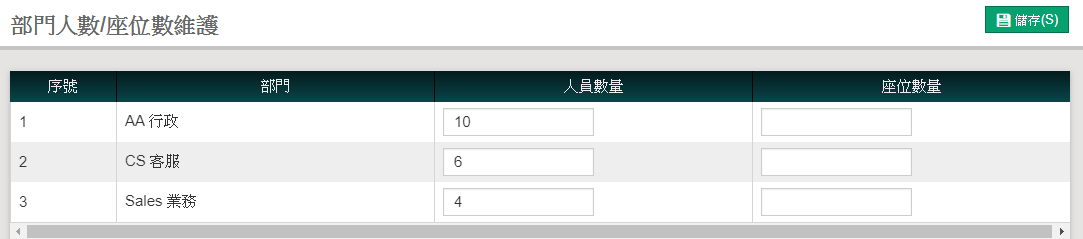 2. 傳票出入完畢後,再至【維護作業>基本資料>部門人數/座位數維護】中,確認部門人數或座位數是否需要變更。