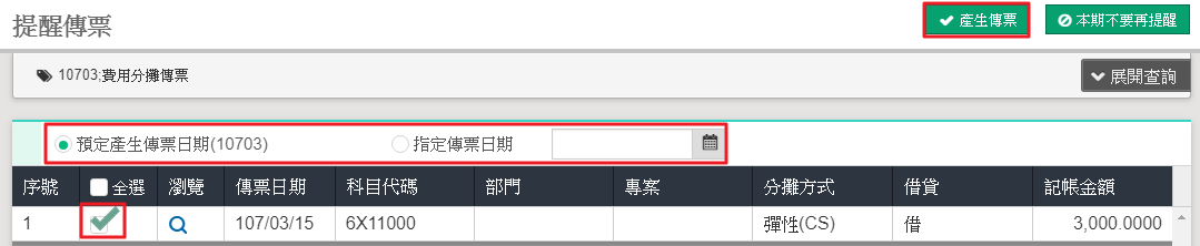 4. 請先選擇是否有指定傳票日期,指定日期須自行輸入;日期選擇後,請勾選列表中需要產生傳票的項目,並點擊右上方【產生傳票】按鈕。