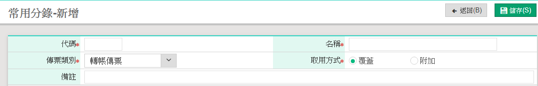 2. 輸入分錄的「代碼、名稱、傳票類別、取用方式」等資料後,點擊【儲存】