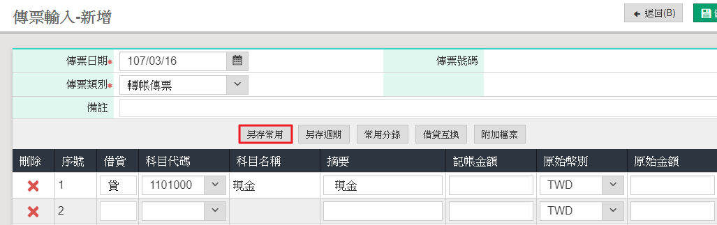 1. 請由【日常作業>傳票輸入】進入,在此新增一份傳票後,點擊【另存常用】