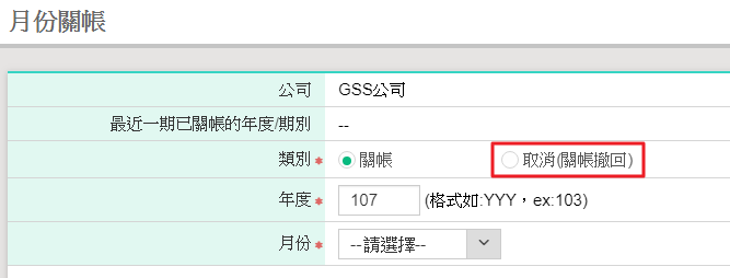 請至【日常作業>月份關帳】,選擇日期並勾選「取消(關帳撤回)」,按下右上方的「確定」按鈕。