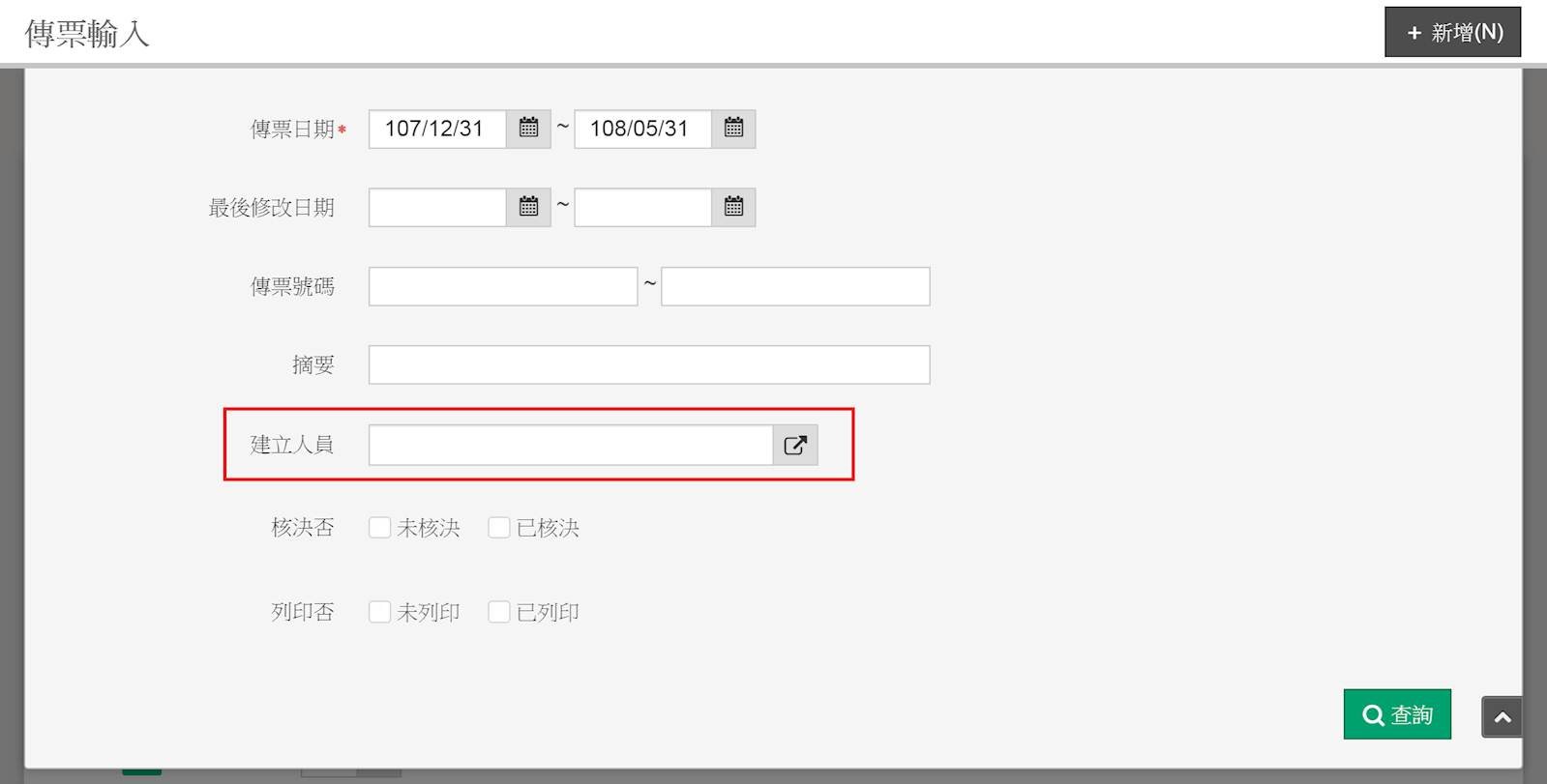 請至【日常作業>傳票輸入】中,輸入「建立人員」查詢(如下圖)。