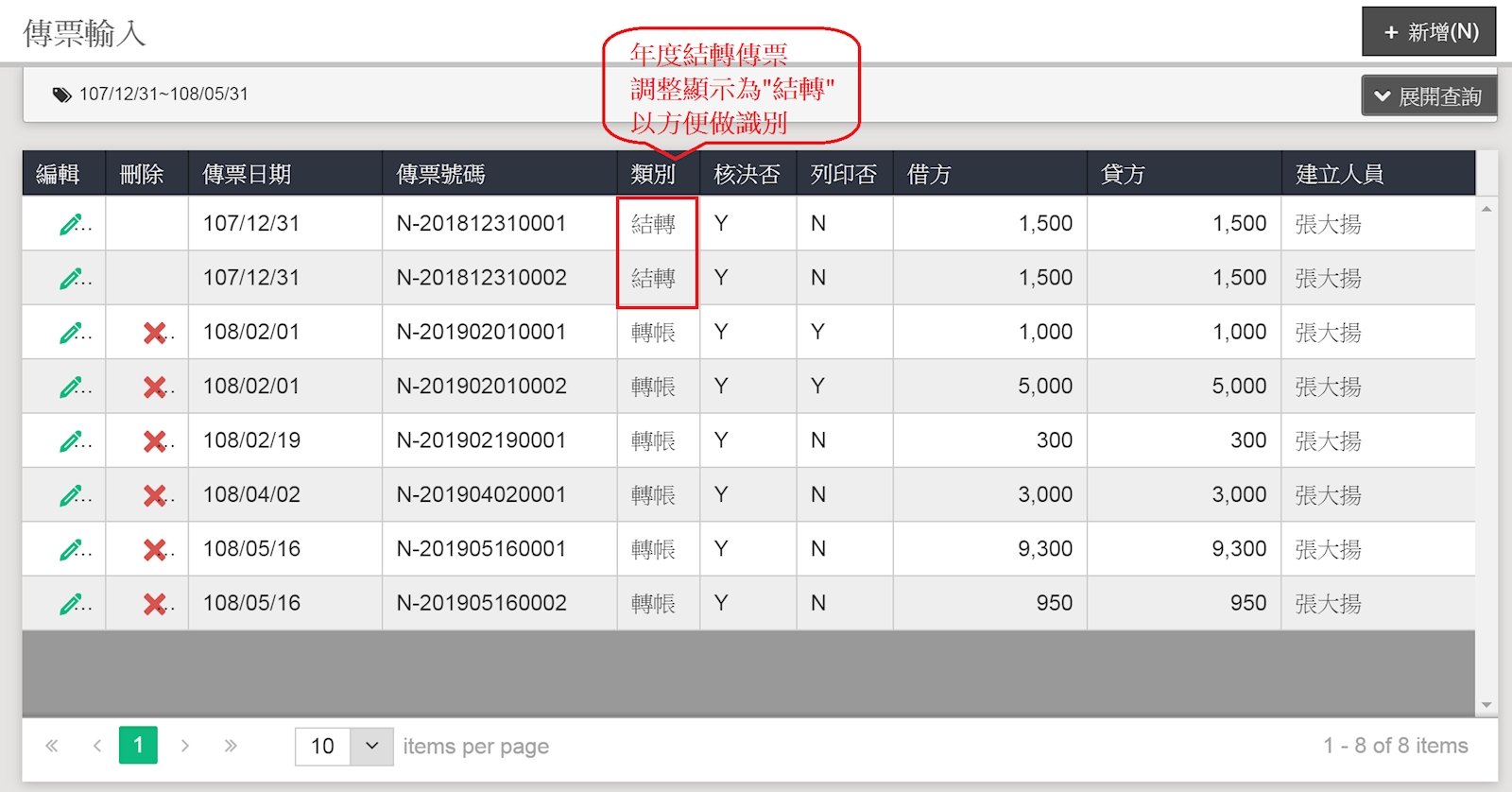 會在列表中的類別中會顯示為「結轉」以方便辨認結轉傳票。