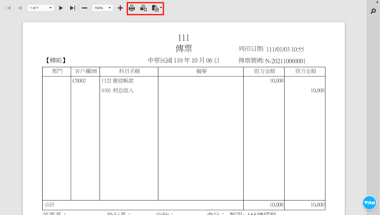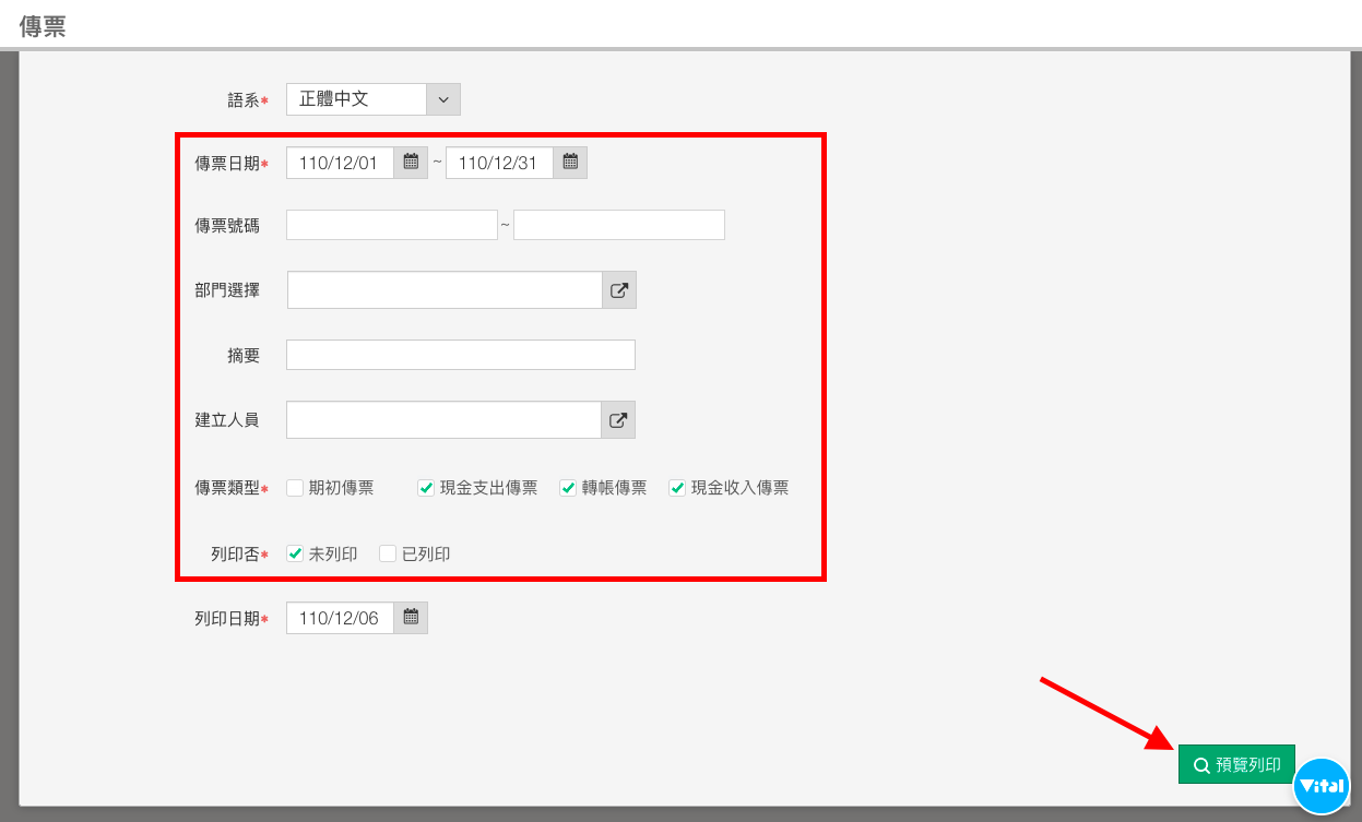 可以依傳票日期、傳票號碼區間等條件查詢,條件設立完成後,點選右下角的「預覽列印」,您就可以印出所有查詢出來的傳票。