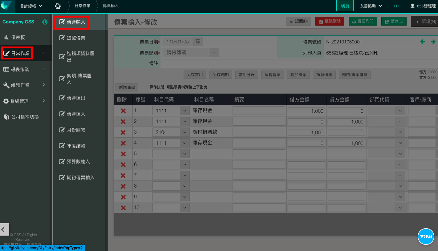 1. 點選【日常作業>傳票輸入】。