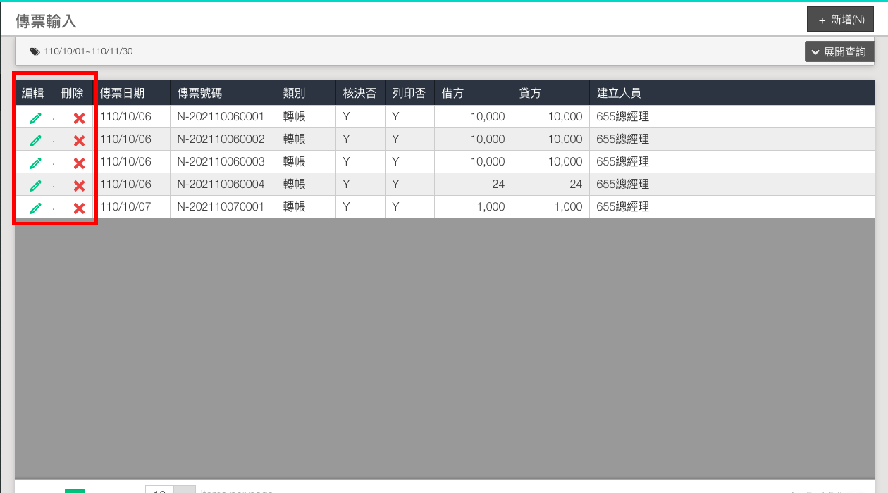 查詢出傳票後,可以點選前方的鉛筆圖示,修改傳票;或是點擊X圖示,刪除傳票。