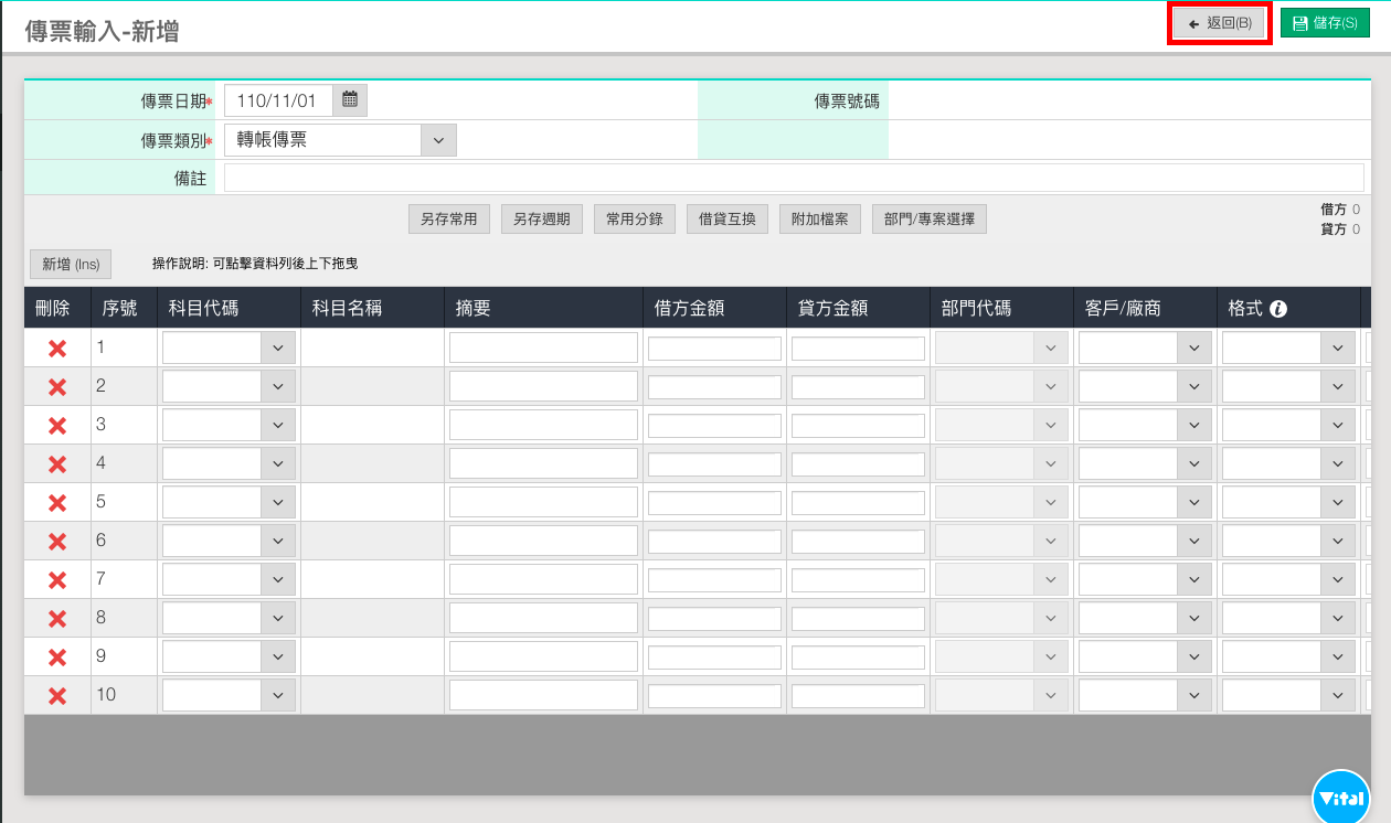 進入傳票輸入畫面後,點選上方的「返回」。