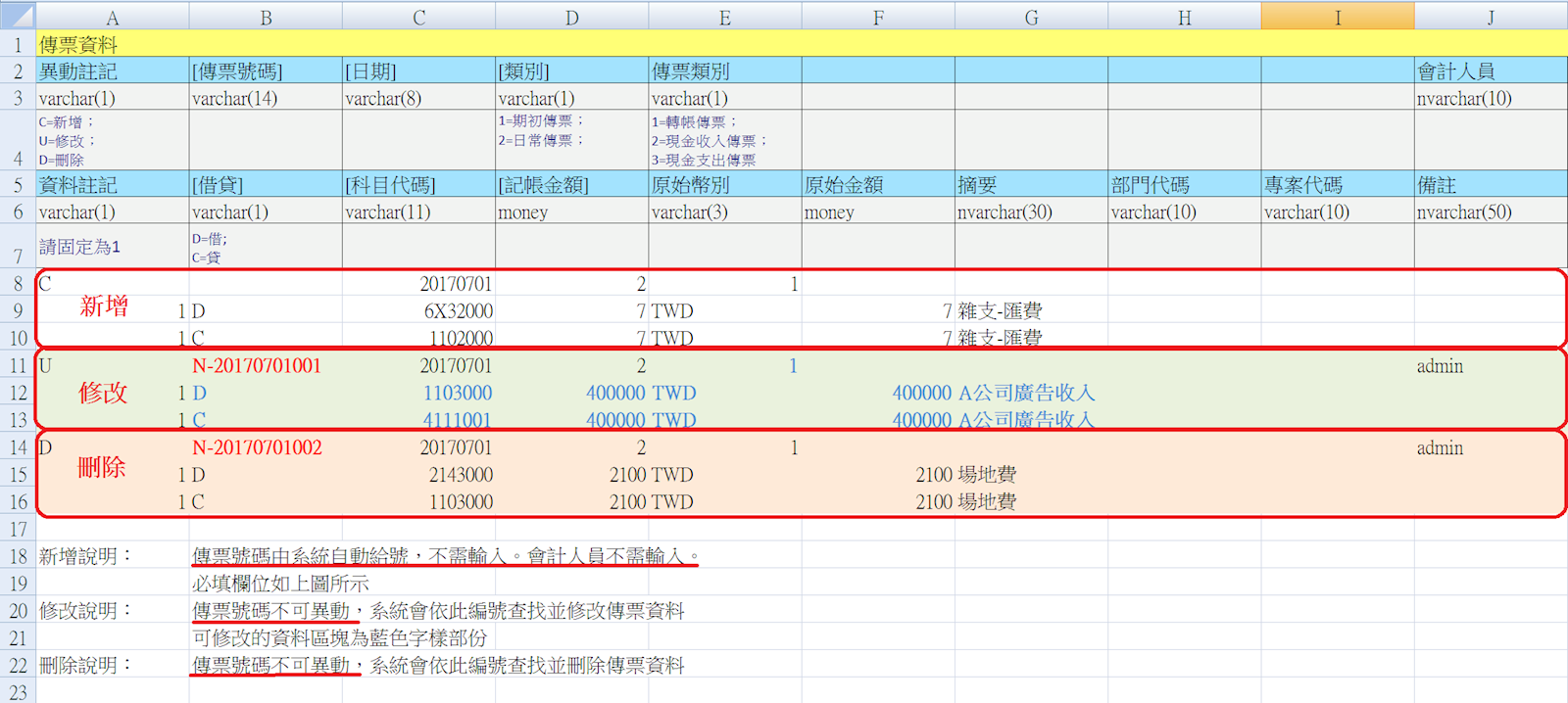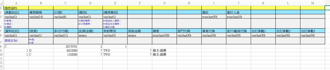 3. 在空白範本檔中,請勿刪除具有底色之欄位名稱區域,但是可以刪除檔案中的範例資料,輸入您的傳票資料