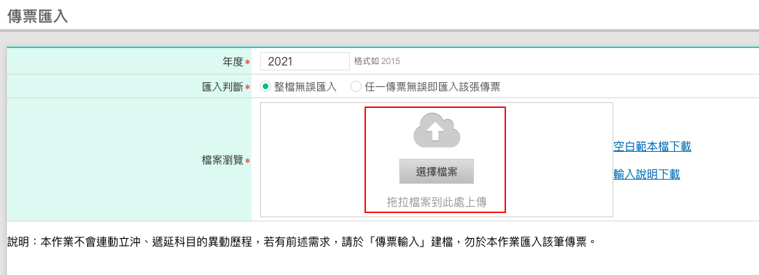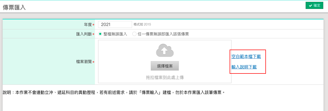*匯入判斷:「整檔無誤匯入」意指系統會檢查檔案資料,如無格式或其他錯誤,方可整檔匯入;「任一傳票無誤即匯入該傳票」則指檔案內可允許錯誤資料,除該資料無法匯入之外,其他無誤傳票可正常匯入系統中。