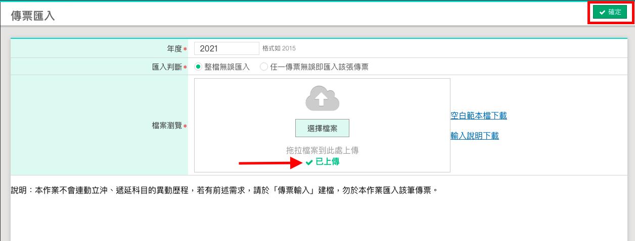 6. 檔案上傳完成後,會顯示「已上傳」,如下圖所示;接著,點選右上方的「確定」,將傳票匯入系統中。