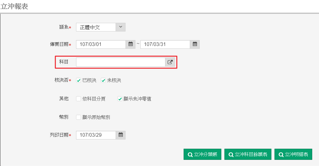 可以。請在立沖報表的查詢條件中,於「科目」欄位選擇指定項目。