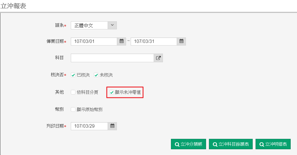 請至【報表作業>會計日常報表>立沖報表】中,勾選「顯示未沖零值」,即可查詢尚未沖銷完畢的資料。