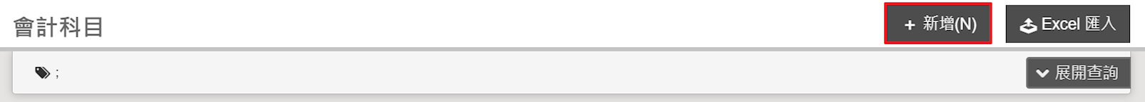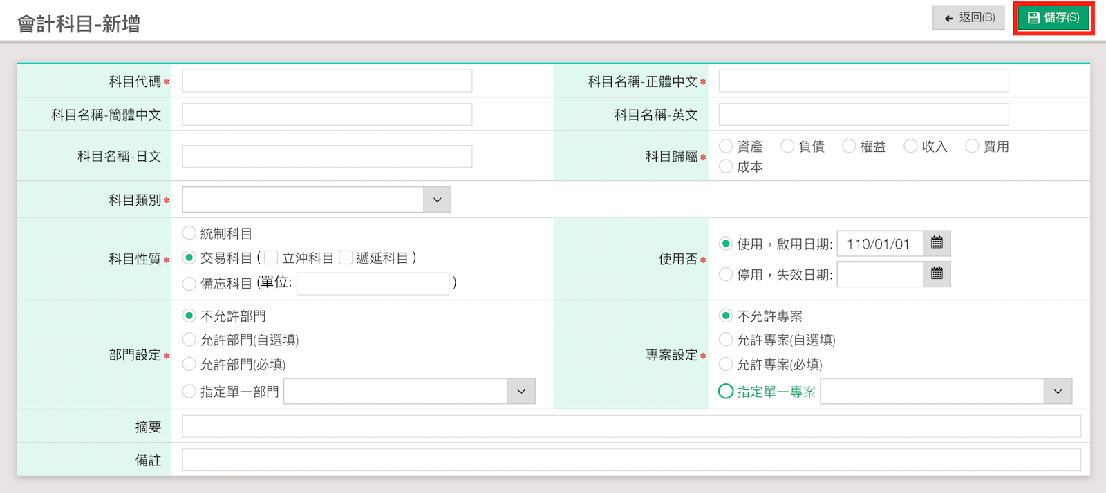 請至【維護作業>科目資料>會計科目】,右上方點選【新增】,依序填入資訊,前方有紅色星號者為必填欄位,完成後按【儲存】即可。