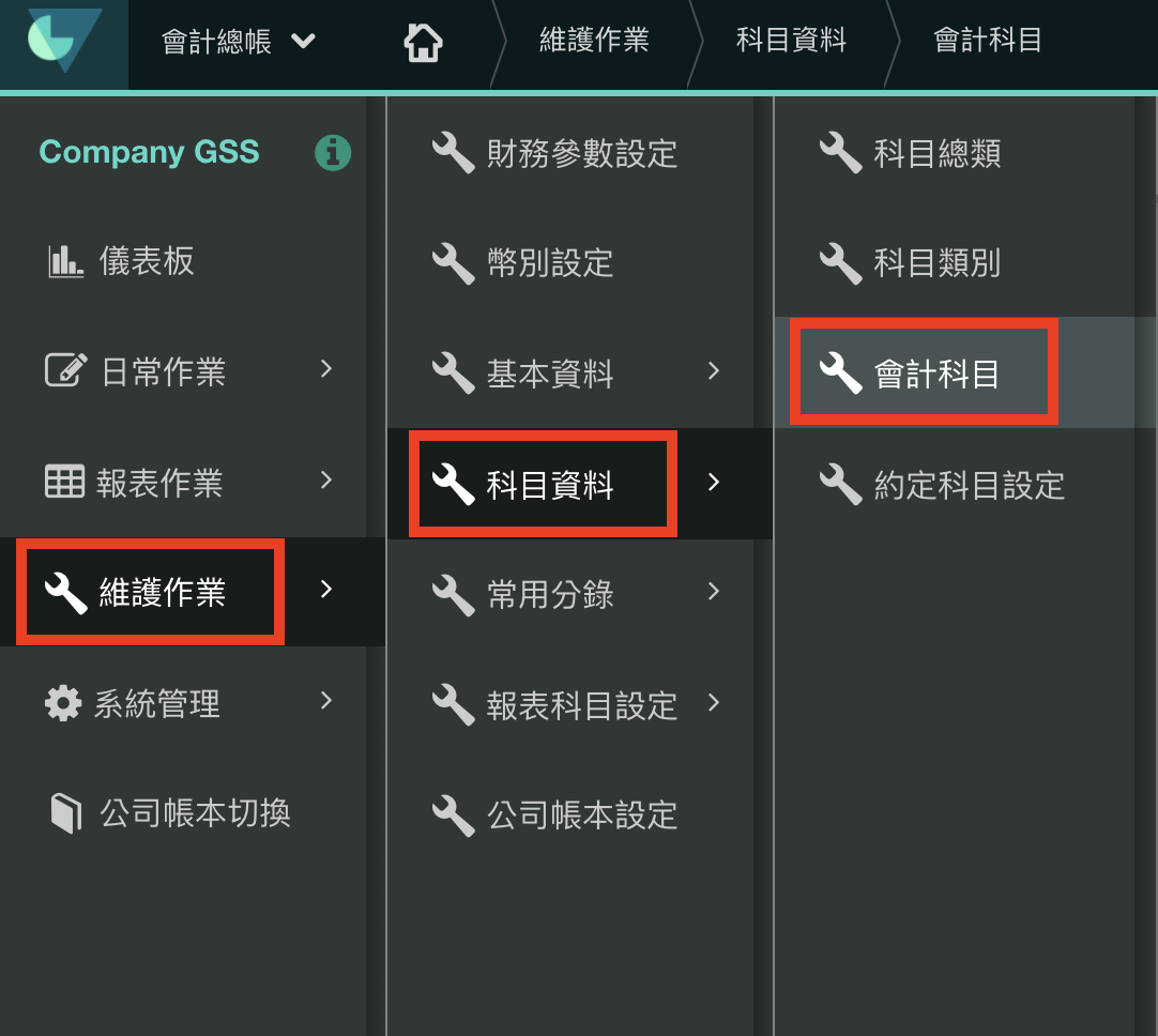 點擊【維護作業>科目資料>會計科目】,進入畫面後,可以點選前方的鉛筆圖示,進行會計科目的修改;或是點擊X圖示,刪除該會計科目。