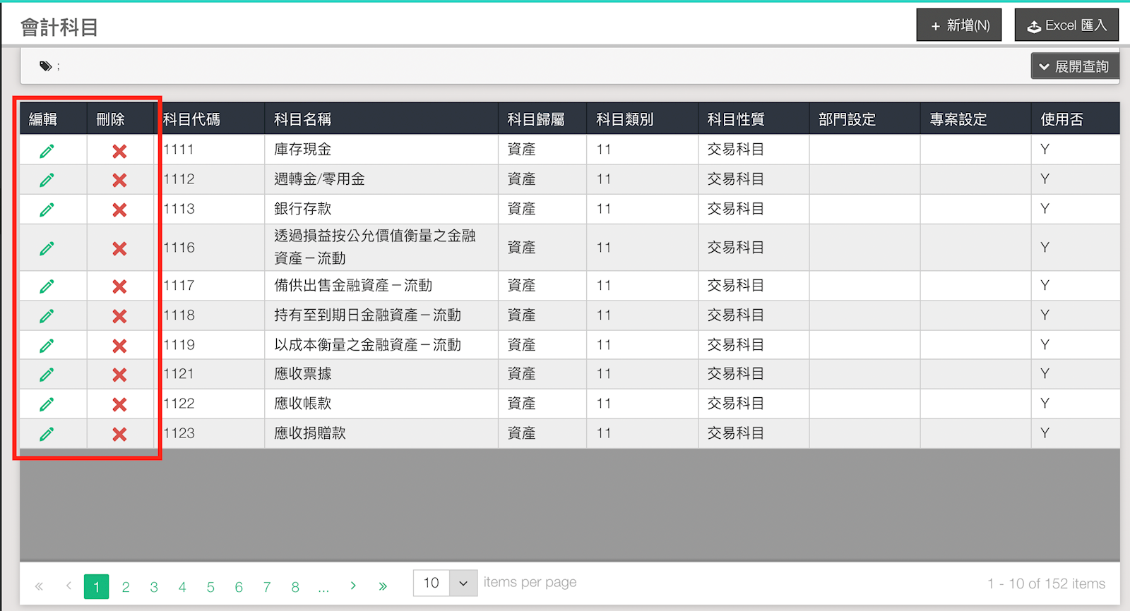 2. 點選【鉛筆】圖示,修改會計科目;或點擊【X】圖示,刪除該會計科目。