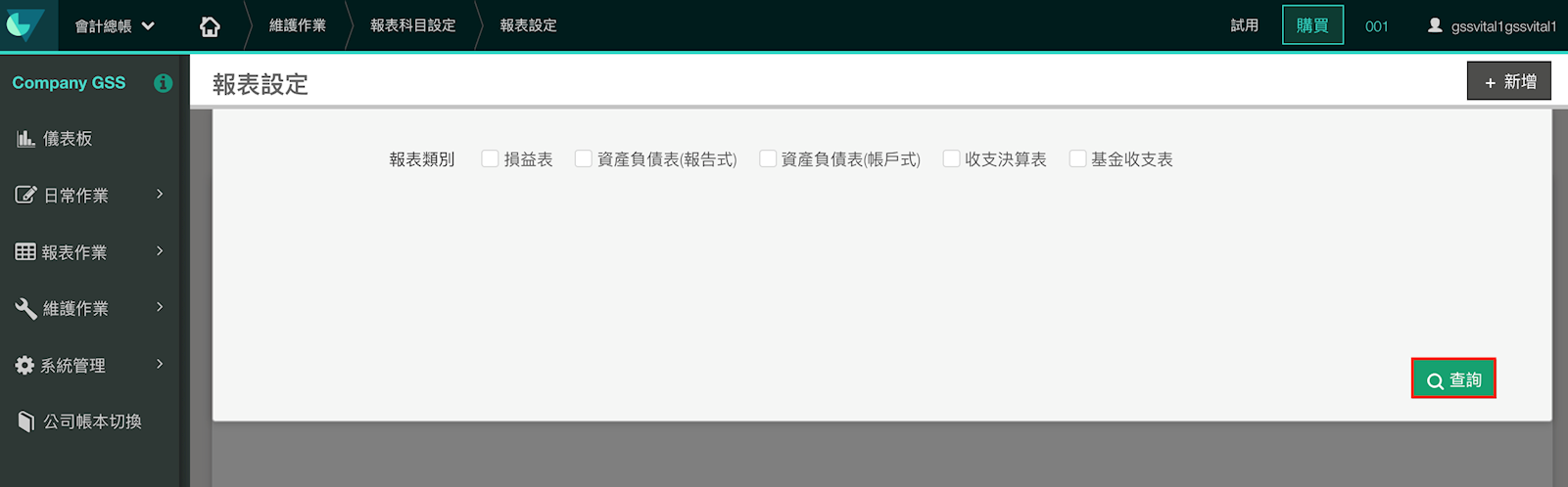 1. 請至【維護作業>報表科目設定>報表設定】,勾選指定報表後,點擊「查詢」
