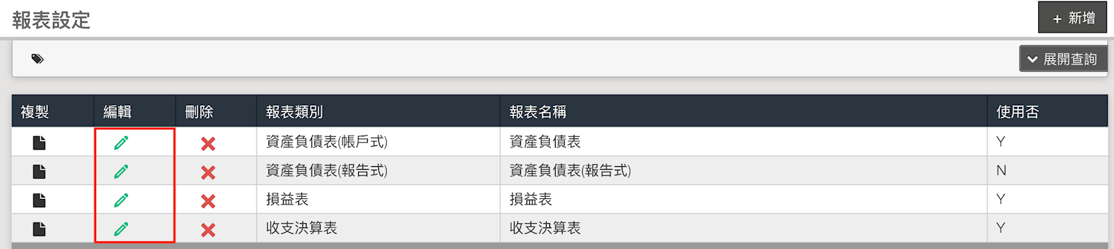 2. 在欲修改的報表項目前點選綠色的鉛筆圖示,開始編輯