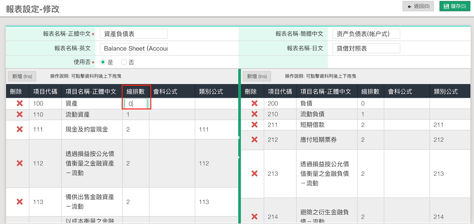 請至【維護作業>報表科目設定>報表設定】,勾選指定報表後,點擊「查詢」。在欲修改的報表項目前點選綠色的鉛筆圖示,開始編輯。找到您想要縮排的項目,於「縮排數」欄位中點一下,即可直接輸入縮排數,完成後請記得「儲存」。