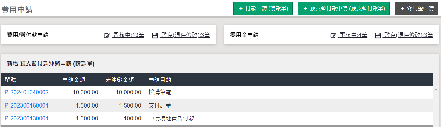 「費用申請」功能提供機構內其他成員於線上填寫費用相關表單,包含請款單、預支暫付款單、暫付款沖銷及零用金申請,整合 Vital BizForm 可進行線上簽核,審核通過,系統自動轉入 AP/AR 之「應付帳款立帳」,可續進行後續付款處理。