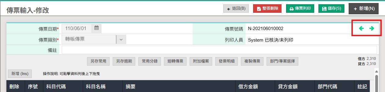 系統在編輯頁面右上方顯示的箭頭符號 ⭠⭢,提供使用者快速切換上一筆、下一筆傳票。