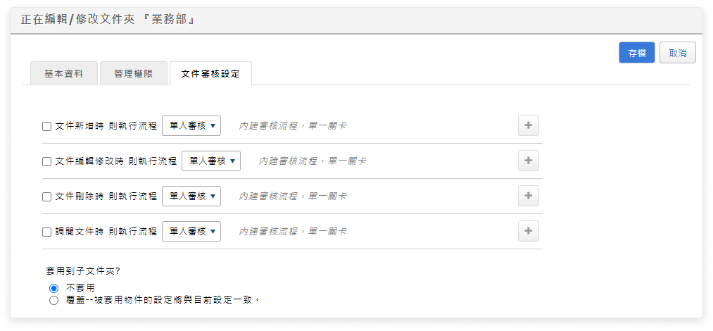 編輯文件夾的文件審核設定時,可選擇「套用到子文件夾」的「覆蓋」選項,按「存檔」後將會自動套用至子文件,此功能在新增子文件夾時也會自動繼承文件夾的審核設定。
