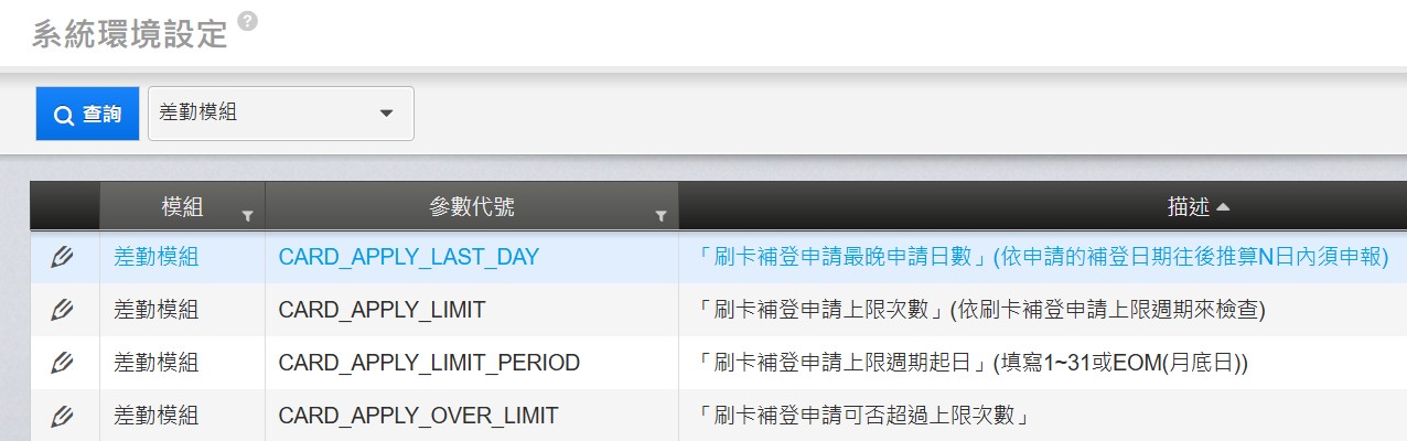 4. 系統篩選出刷卡補登相關設定,請點選要調整項目前方的鉛筆進入編輯。