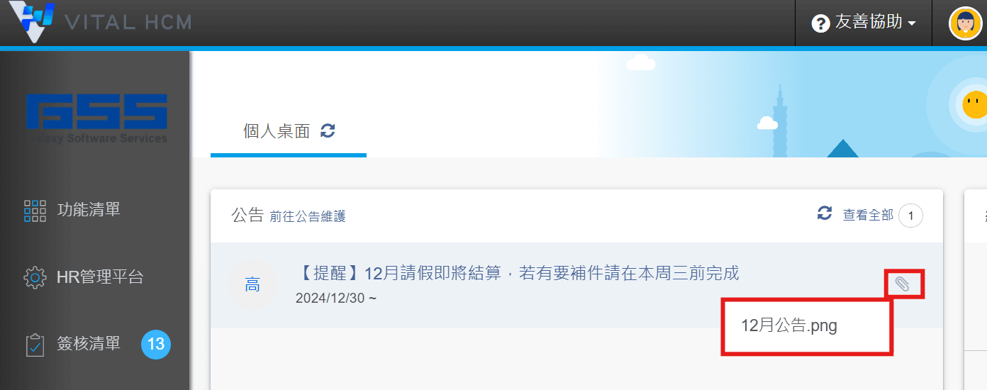 在系統首頁的公告板中可查看所有公告,如需下載附件請點選該公告右方附件圖示,並點選要下載的【附件名稱】即可完成下載。
