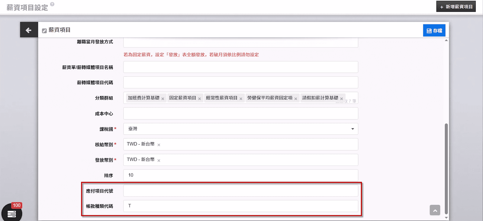 【薪資項目設定】增加應付項目代號、帳款種類代碼欄位
