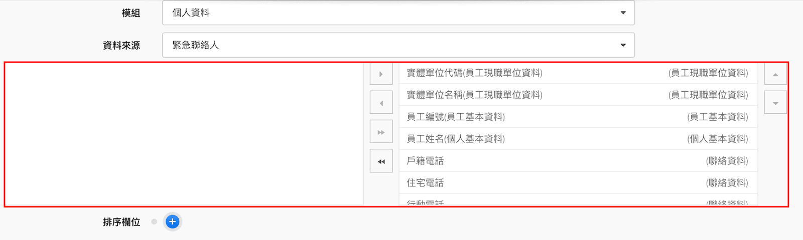 6. 在「挑選欄位」的「模組」選擇「個人資料」;來源選擇「緊急聯絡人」