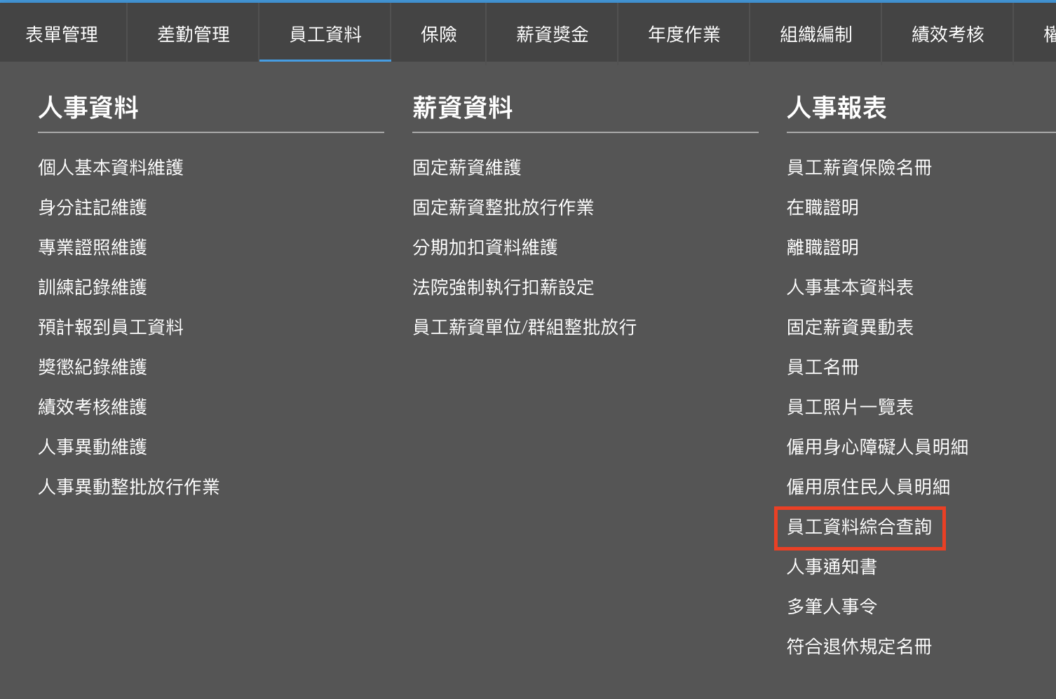 路徑:員工資料/人事報表/員工資料綜合查詢
