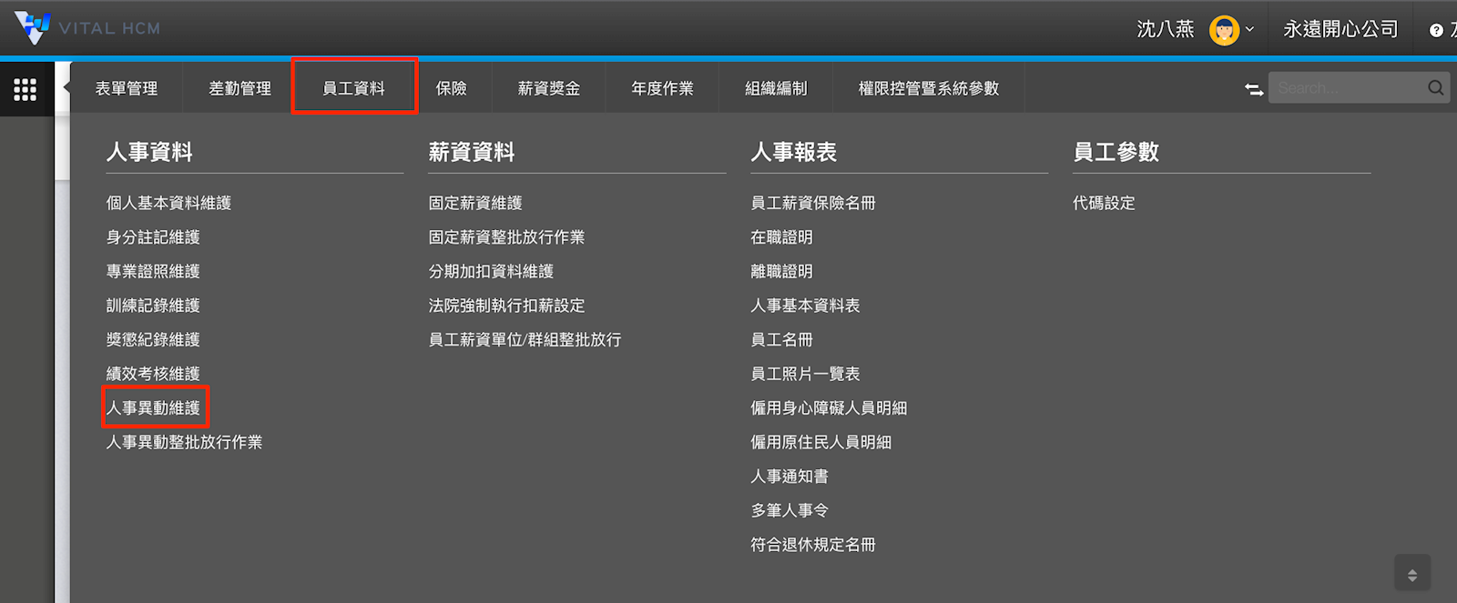 1. 至【員工資料>人事資料>人事異動維護】。