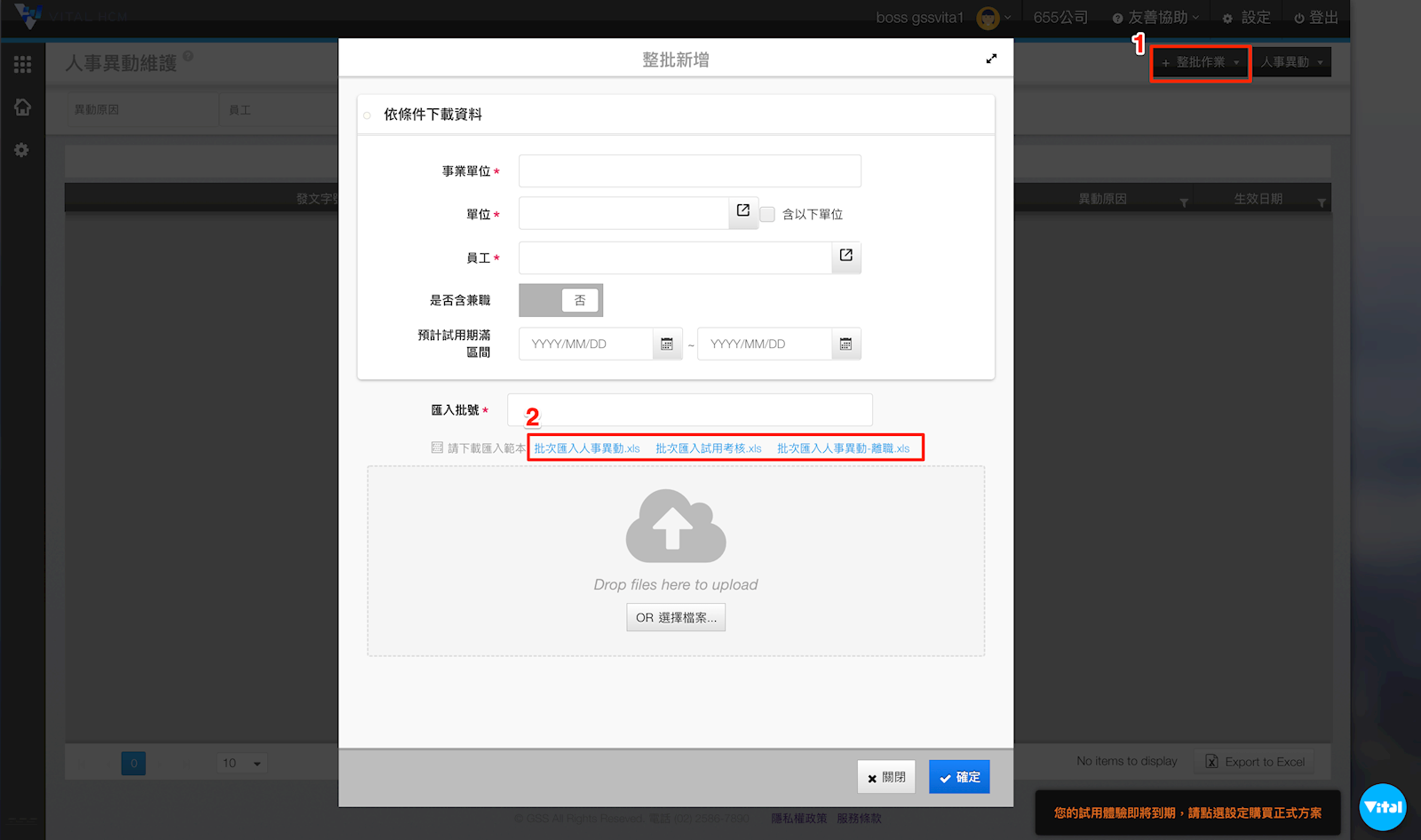 2. 點擊右上角【整批作業>整批上傳】,並可以在彈跳視窗中選擇匯入範本。填寫好範本後,再將資料上傳即可大批進行人事異動。