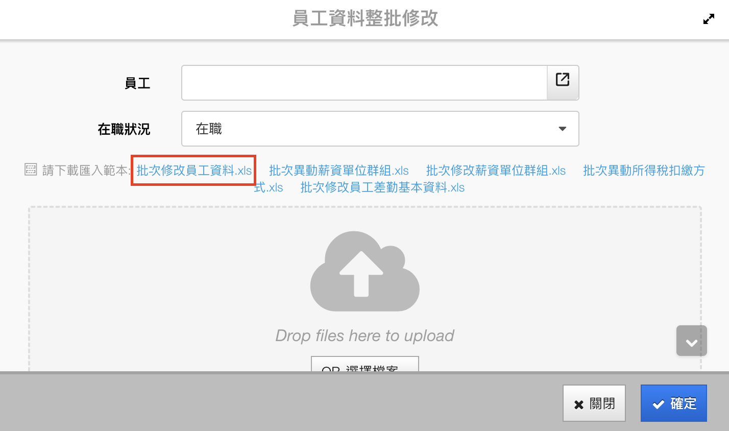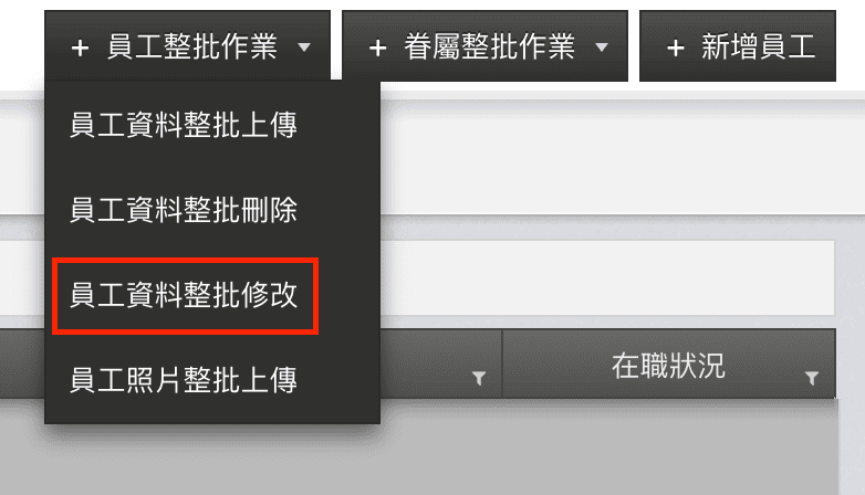 請到「員工資料/個人基本資料維護/(右上角)員工整批作業/員工整批資料修改」,下載「批次修改員工資料」,改完可直接於「批次修改員工資料」處上傳修改過的檔案。