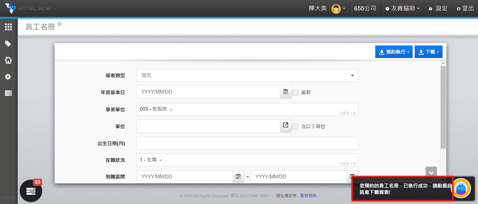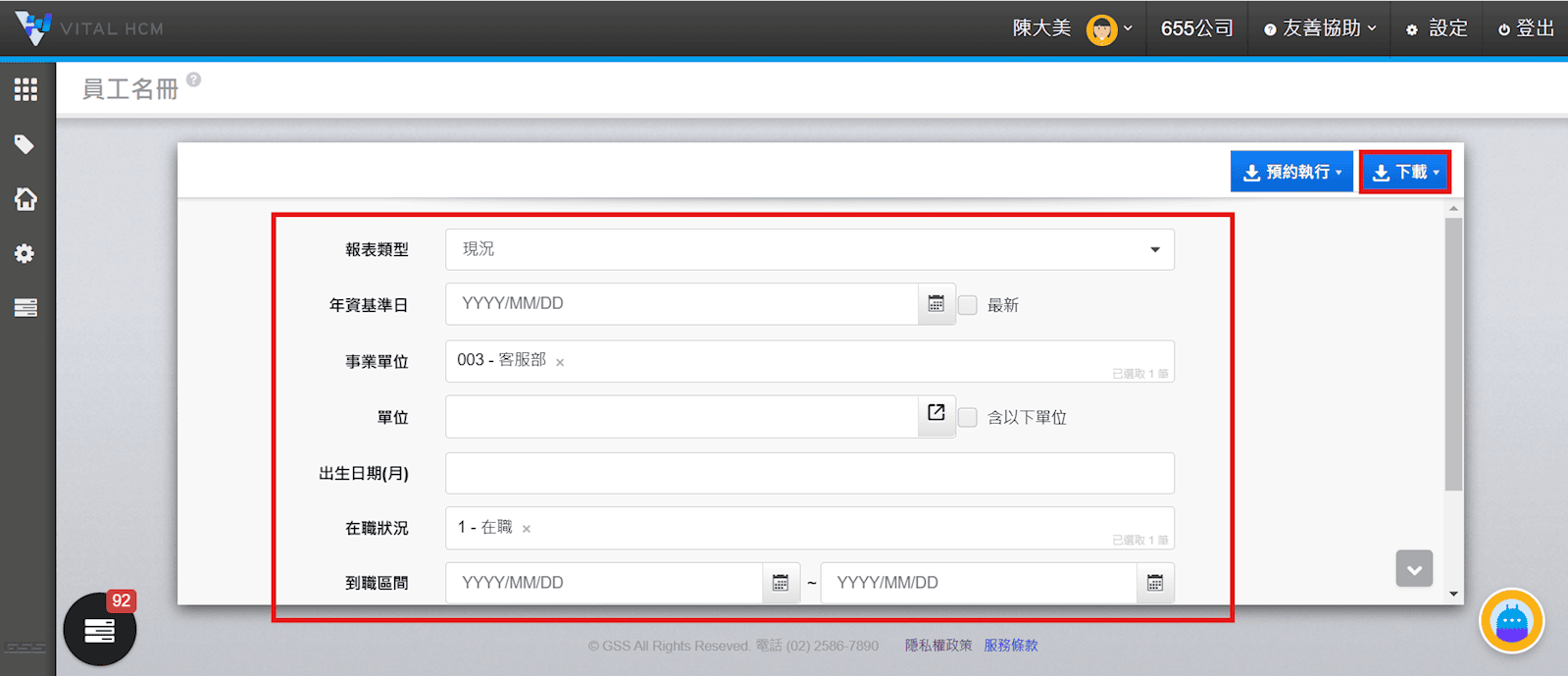 2. 輸入要查看的員工名冊篩選條件後按【下載】系統即會開始準備下載。