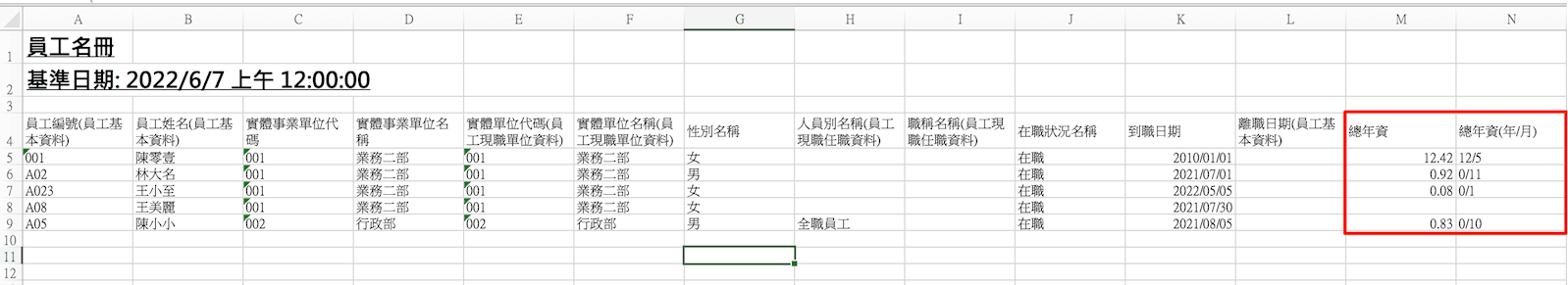 4. 在下載的 excel 檔案中,可以看見各員工在系統內經歷的總年資。