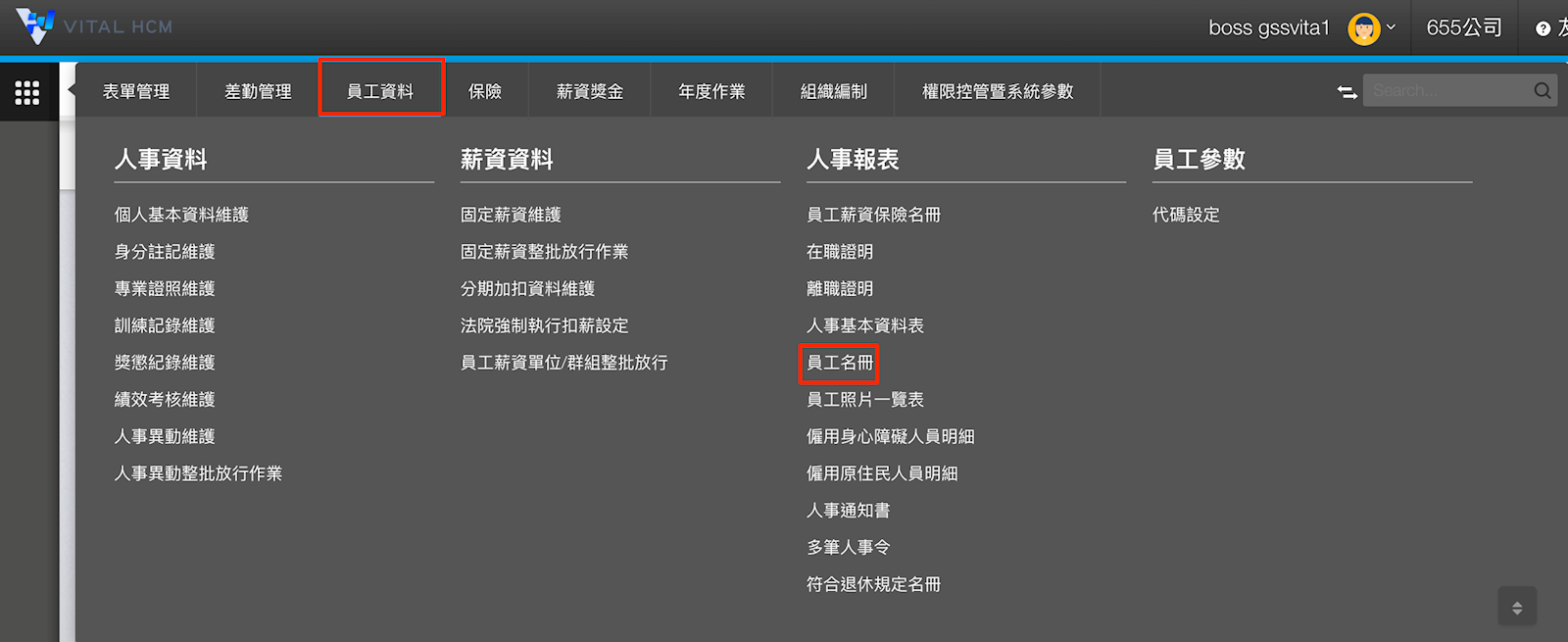1. 點擊【員工資料>人事報表>員工名冊】。