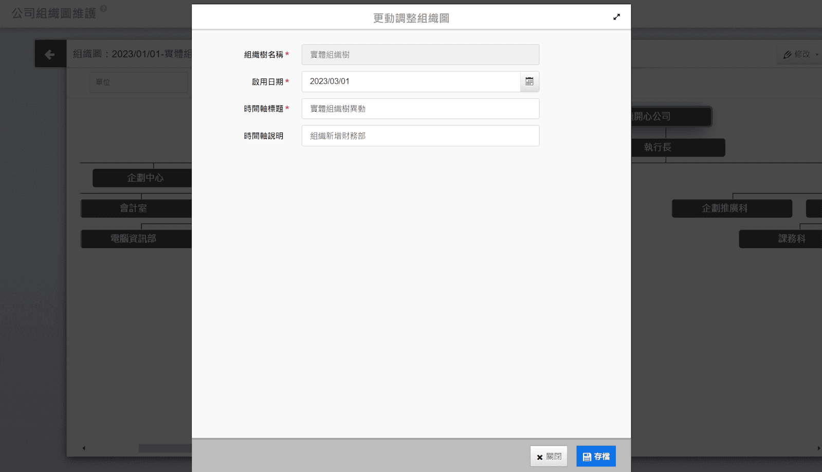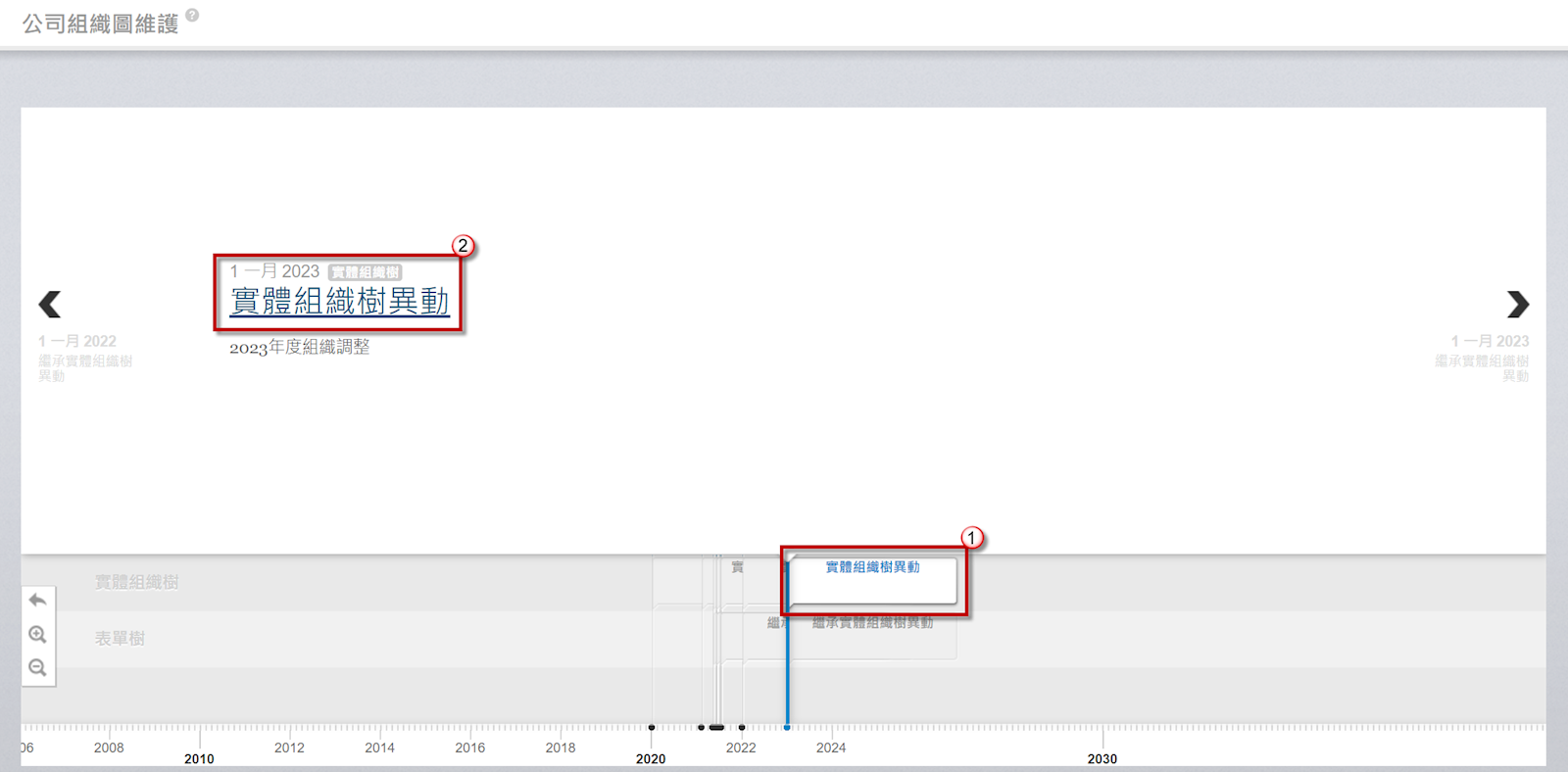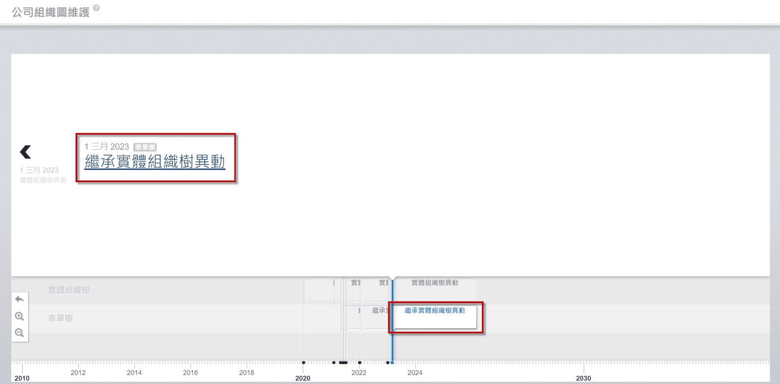 回前頁查看下方時間軸,可看到因設定繼承,已自動生成表單組織